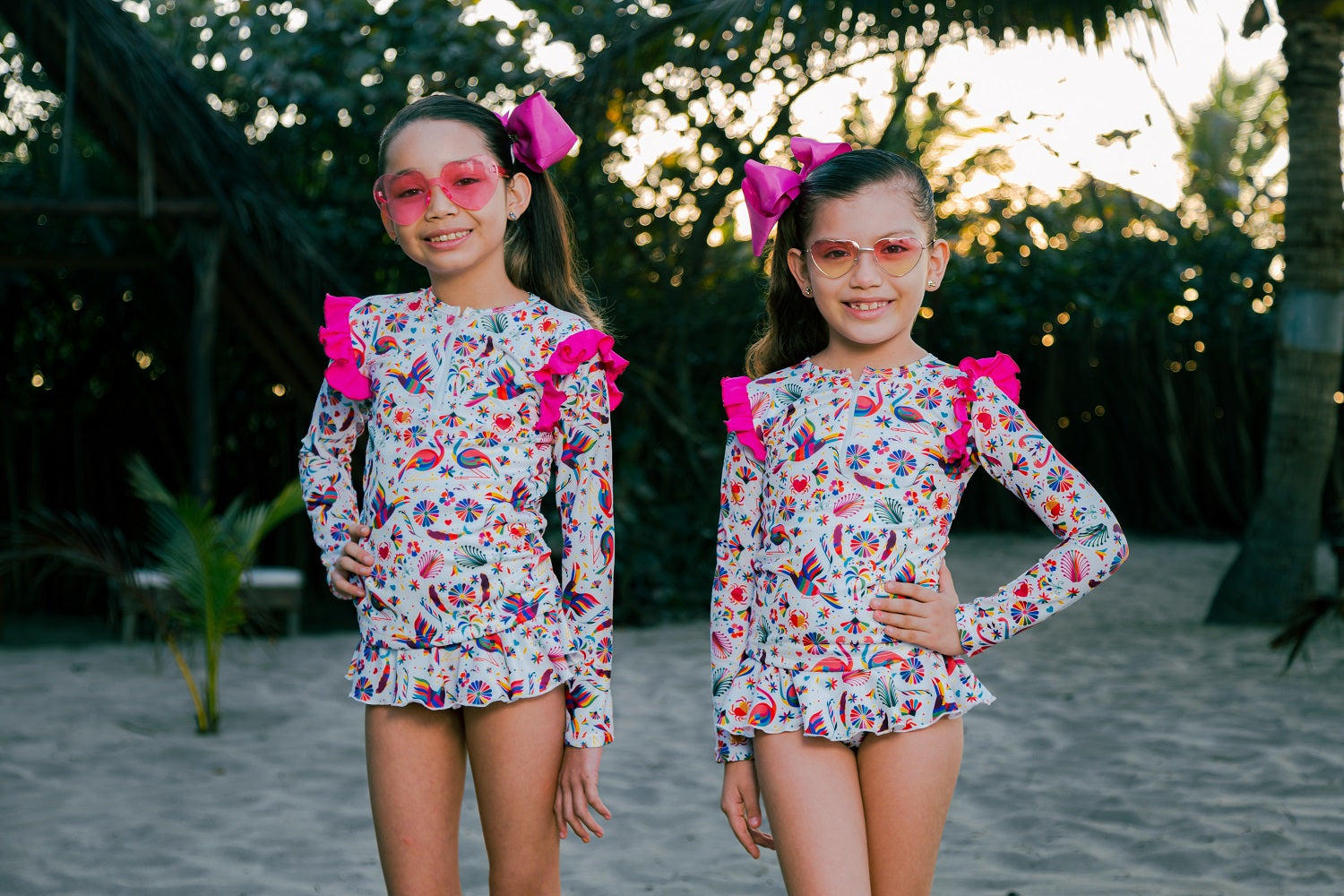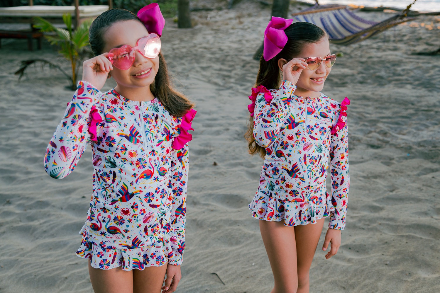 Girl's one-piece, multicolor, long-sleeved swimsuit - Print for duos and family